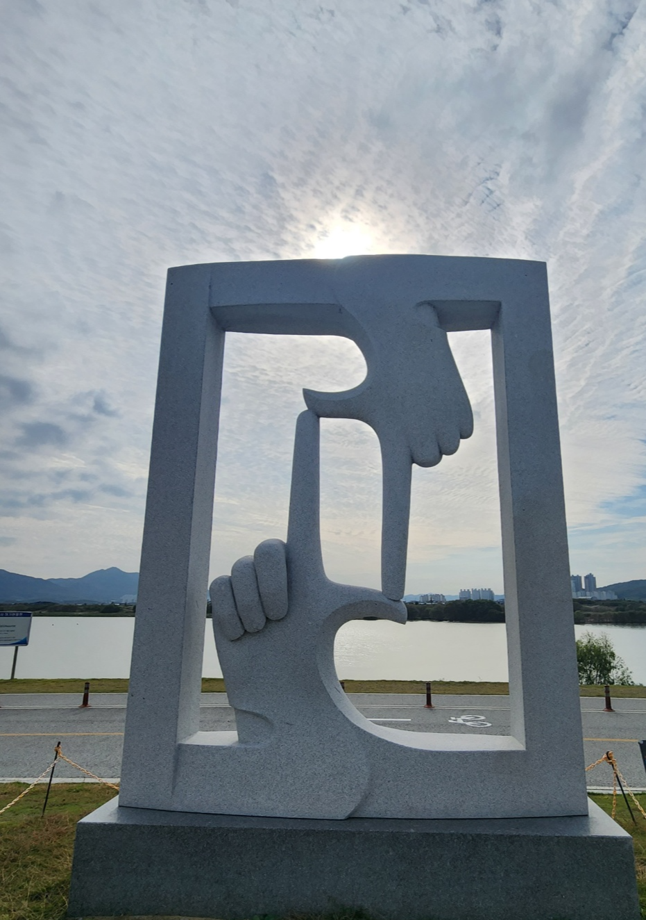 기둥과 상인방과 기단의 역할을 맡고 있는 각요소가 일체화된 사각 프레임을 이루고 있는데 내부 안쪽으로는 도식화된 이미지의 손동작 한가지를 새겨 넣었다, 보통 가위 모양을 한양 손가락으로 사진을 찍는 시늉을 할 때 짓는 모양이다. 이 재치