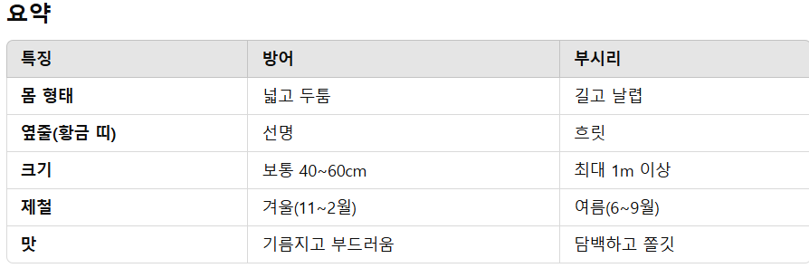 방어와 부시리는 한국인이 사랑하는 횟감과 구이 재료로 유명한 생선이지만, 같은 어종(방어류)에 속하면서도 미묘한 차이가 있다. 이를 구별하기 위해 외형, 크기, 서식지, 계절적 특징 등을 살펴보겠다.