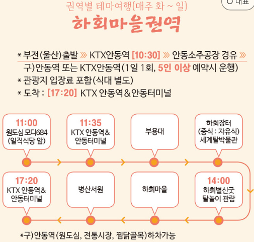 - 하회마을 권역: 화요일부터 일요일까지 운행되며, 요금은 성인 25,000원, 청소년 및 어린이 23,000원.