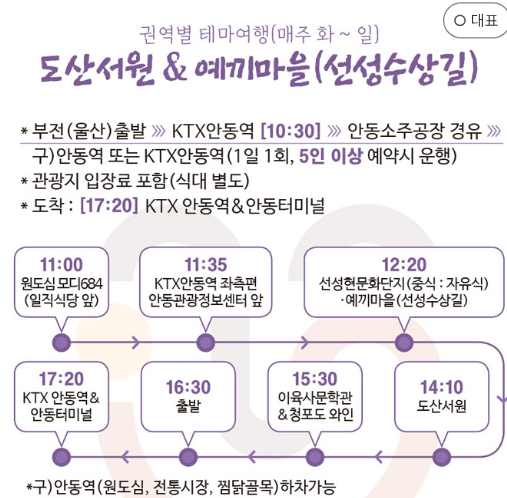 - 도산서원 권역: 화요일부터 일요일까지 운행되며, 요금은 성인 25,000원, 청소년 및 어린이 23,000원.