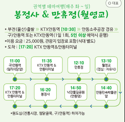 - 봉정사 & 만휴정 권역: 화요일부터 일요일까지 운행되며, 요금은 성인 25,000원, 청소년 및 어린이 23,000원.