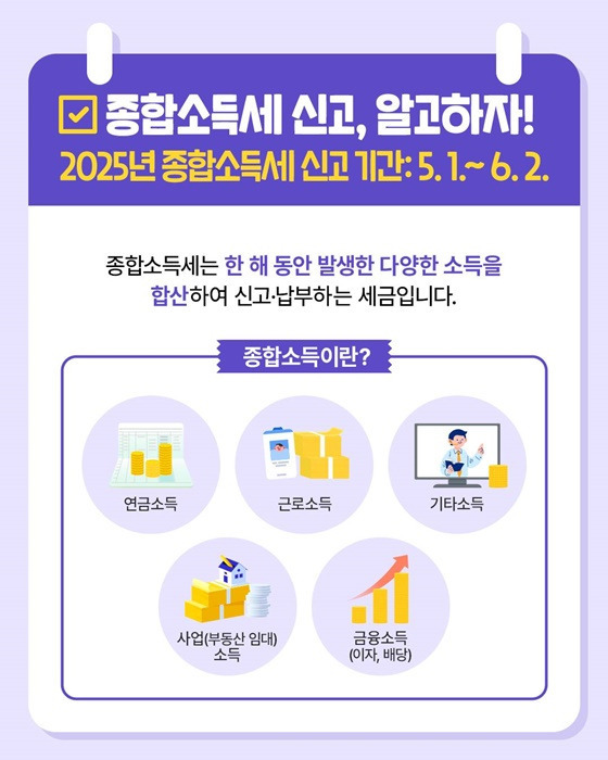 종합소득세는 개인이 1년 동안 얻은 다양한 소득을 합산해서 과세하는 세금이다. 말 그대로 ‘종합’된 소득에 대해 부과되는 세금이다. 일반적으로 매년 5월 1일부터 5월 31일까지가 신고 및 납부 기간이다.